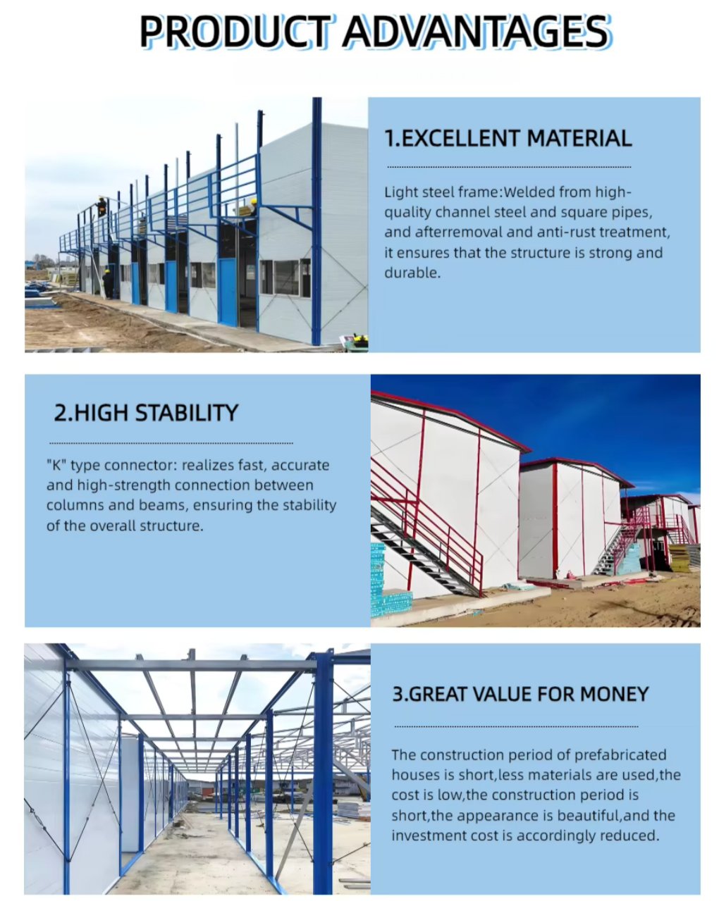 The construction period of prefabricated houses is short, less materials are used,the cost is low, the construction period is short, the appearance is beautiful, and the investment cost is accordingly reduced.